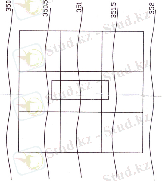 1. 1 Табиғи бет белгілерді берілген жер бедерінде интерполирлеу арқылы анықтайды. Ол үшін шаршының әрбір төбесі арқылы ұзындығы с болатын көршілес горизонталь арасынан ең қысқа қиылысу түзулерін жүргізіп, одан кейін шаршы төбелерінен горизонтальдармен қиылысу нүктесіне дейінгі ұзындықтары в 1 және в 2 өлшейді (мм) . Сонда шаршы төбесіндегі табиғи бетінің белгісі келесі формуламен анықталады: