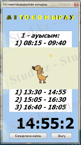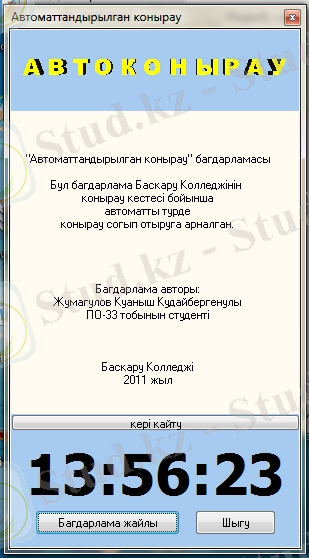 Өздігінен қоңырау соғатын бағдарлама жазу керек. Басқару колледжінің қоңырау кестесі бойынша қоңырау соғылады. Әр қоңырау сайын компьютер экранында анимация ойнатылады.