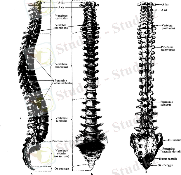 1) алға қарай шығыңқы сүйірленген (promontorium) сегізкөз бөлімінде иілісі бар тік орналасқан омыртқа жотасы;