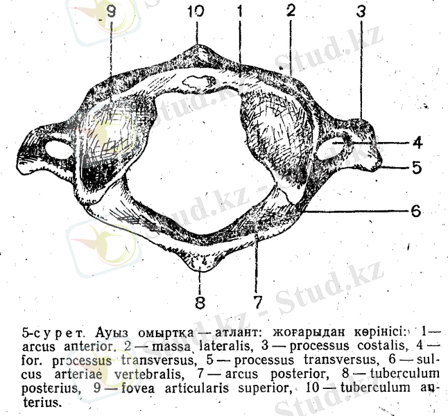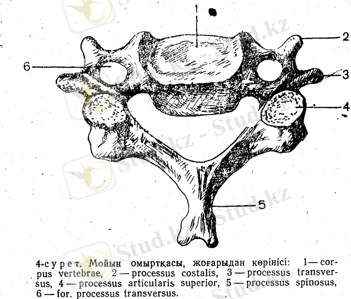 Омыртқалардың жеке түрлері. 1. Мойын омыртқалары, шейные позвонки, vertebrae cervicales (4-сурет) . Мойын омыртқала-рына түсетін аздау (омыртқа жотасының темен, жатқан бөлімде-рімен салыстырғанда) жүктемеге сәйкес олардың денелері де кішілеу келеді. Көлденең өсінділер көлденең өсінді тесіктерінің, foramina processus transversalіа болуымен сипатталады, олар көл-денең өсінділердің қабырға қалдығымен (рудиментімен), processus costarius, бітісіп-өсуінен пайда болады. Осы тесіктер жиынтығы-нан пайда болатын өзек (канал) оларда өтетін омыртқа артерия-сы мен венасын қорғайды. Көлденёң өсінділердің уштарында аталған бітісіп-өсу екі төмпешік - tubercula anterius et posteriоrs түрінде білінеді. VI омыртқаның алдыңғы төмпешігі күшті дамы-ған және tuberculum caroticum - ұйқы төмпешігі. деп аталады (оған қанағуды тоқтату үшін ұйқылық артерияны қысып басуға болады) . VI және VII омыртқалардан басқаларында сүйір өсінді-лер ұштарында еқіге бөлінген. VII омыртқада сүйір өсінді үлкен келеді, сондықтан VII мойын омырткасы vertebra prominens (шығынқы) деп аталады, чхны тірі адамнан оңай сипап білуге болады да, бүны диагноз қою мақсатында омыртқаларды санау үшін пай-даланады