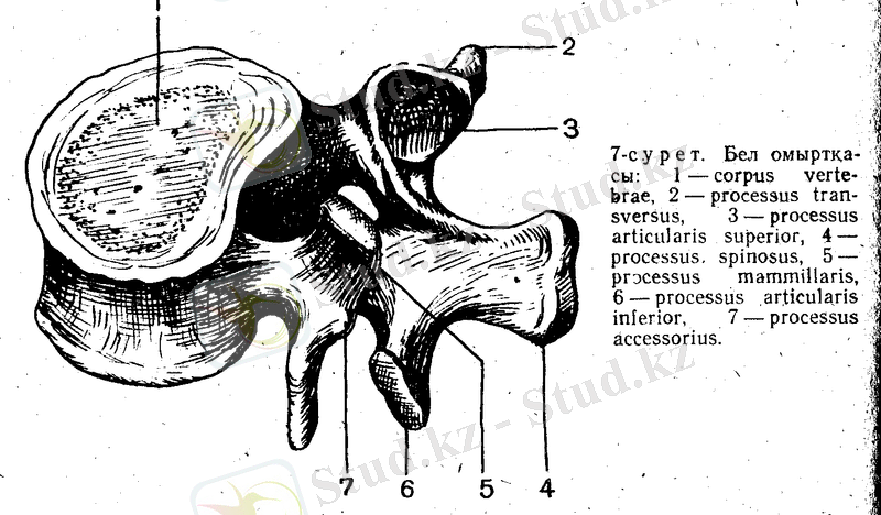 3. Бел омыртқалары, поясничные позвонки, VERTEBRAE LUMBALES омыртқа жотасының жоғарыда жатқан бөлімдеріие карағанда көбірек түсетін жүктемеге сәйкесті денелерінің үлкендігімен өзгешеленеді. Сүйір өсінділер тура артқа қарай бағыттал-ған, буын өсінділері сагитальды орналасқан. Көлденең өсінді өзінің кеп белігінде нағыз көл^іенең өсіндімен барынша қосылып-бі-тісіп кеткен жэне бір бөлігі оның табаны артында кішкене өсінді түрінде сақталған, қосымша дёп дүрыс аталмайтын (accessorius - косымша, косылатын) рудименттік қабырға болып табылады