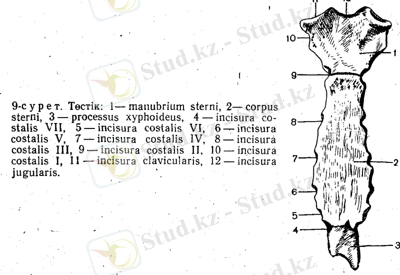 Төстік. Пішіні жағынан канжарға үқсайтын төстік, грудина, sternum үш бөліктен түрады: жоғарьг- бөлігі - сабы, manubrium sterni, ортаңғы бөлігі - денесі, corpus sterni, және төменгі бөлігі-семсертәрізді өсінді, processus xiphoideus. Саптың жоғарғы жие-гінде қамытты ойық, incisura jugularis, орналасады, оның бүйірлерінде әр жағында біреуден бұғана ойығы, incisura clavicularis, болады, онда бүғананың төстік үшымен буындасады. Саптың темени жиегі дененің жоғарғы жиегі өзара алға қарай шығыңқы төстік бұрышы, ajrigulus costales, деп аталатынды түзеді. Төстік денесінің жиегінде қабырғалық ойықтар, incisurae costales, 'жата-ды, олар II қабырғадан бастап шеміршекпен буындасады 9(-сурет) .
