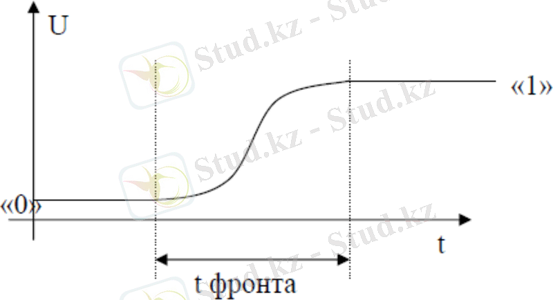 а) Вентильдегі фронттың уақыты (время фронта на вентиле) . «0» және «1» логикалық шарттары кернеудің екі мәнінде көрсетіледі. Элементті бір күйден екінші күйге ауыстырған кезде кернеу қарғымалы түрде өзгермейді. Ол уақыт бойынша өседі. Шамамен төмендегі суреттегідей.