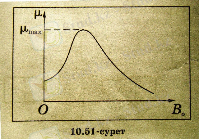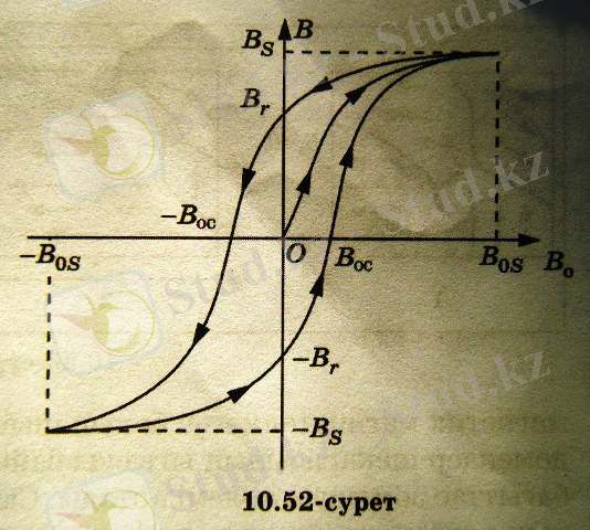 10. 52-суреттен В0 > Вos кезінде заттың магнит қасиетінің ең үлкен мәніне жетуі, яғни магниттік қанығудың басталатынын көреміз. Оны қайтадан нөлдік мәнге жеткізсек, онда ферромагнетик қалдық магниттелуді сақтайды, заттың ішіндегі өрістің индукциясы Вr -ге тең болады.