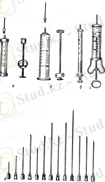 а-«Рекорд»; б - құрама; в - инсулинге арналған; г - «Жане» шприці; д - инелер жиынтығы,