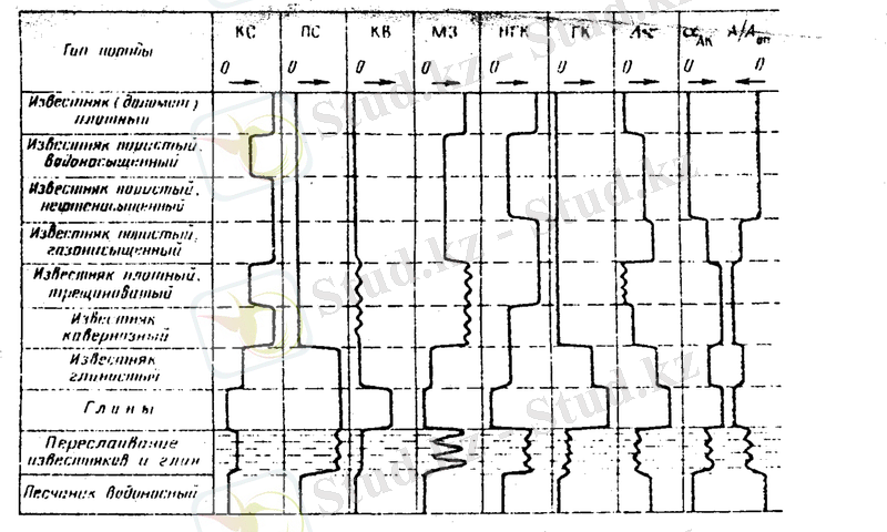 4 - сурет. Карбонатты жыныстар үшін геофизикалық қисықтар кешенінің сұлбалық көрінісі (С. С. Итенберг бойынша) .