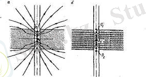7. 11-cypem. Жоғары кедергілі қабаттың ортасында орналасқан А электродынан таралған ток сызықтары: а - әдеттегі зонд; б - бүйірлік зонд