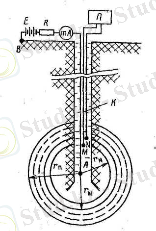 (7. 37) формуласының оң жағындағы шамаларды өлшеу арқылы р мәні анықталады. Бұл формулада - милливольтпен (мВ - вольттың мыңнан бір бөлігі), - миллиампермен (мА), MN, МА және NA ара қашықтықтары метрмен (м) өлшеніп, р - Ом*м-мен есептелінеді.