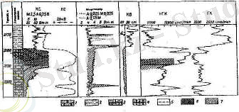 7. 8-сурет. Басқа диаграммалармен қоса мнкрозондтар қисық сызықтарын пайдалану мысалы. 1 - құмтас; 2 - құмды саз; 3 - сазды құмтас; 4 - құрамында газ бар құмтас; 5 - газ-су шекарасы; 6 - кабаттың құрамында газ бар бөлігі; 7 - қабаттың құрамында су бар бөлігі
