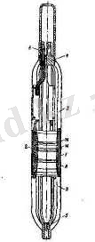 7. 9-сурет. Ұңғымалық резистивимстрдің жалпы түрі. 1 - оқшаулатқыш материалдан жасалған стақан; 2 - электрондық сақиналар; 3 - каптаыа (кожух) ; 4 - жоғары басы; 5 - төменгі басы; 6 - свечалар, А, М, N - электродтар