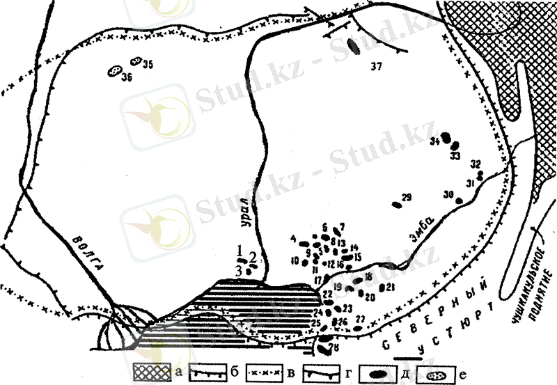 36 - Старшиновка, 37-Қарашығанақ; 38 - Теніз.