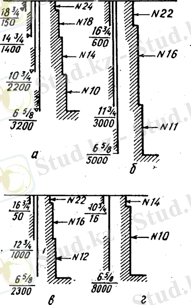 а-күрделі жағдайларда бұрғыланатын терең скважиналарға; б-терең іздеу немесе барлау скважиналарына; в-турбиналы бұрғылаудың барлау немесе пайдалану скважиналарына; г-роторлы бұрғылаудың терең барлау немесе пайдалану скважиналарына.