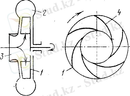 Ортадан тепкіш сораптың сулбасы: 1-жұмыс дөңгелегі; 2-отвод; 3-подвод; 4-қалақша.