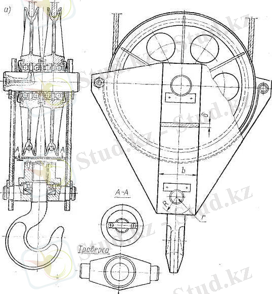 Қысқартылғандарды салпыншақ ( сурет 3. 3, Б ) полиспаста одақ ұзартылғандарды цапфаларда траверстер. Қысқартылған ілмектік салмақты рұқсат етеді жүзеге асыру көтеру жүкты бірнешенін үлкенді биікті, бірақ онын болады қолдану тек қана жұптын еселіліктін полиспаста, траверсті әзірленеді болаттардын 40 немесе 45 және есептейді бүгіліс ортаға қимаға, әлі кеткенге тесікпен үшін құйрықшаға ілмекті. Беріктік қоры аққыштық шегімен, траверстерді күрделі кескін үйлесімін еске алына, қабылданады. Цапфалары дәл осылай есептейді ғой бүгіліске және қысыммен тексереді аралық беру және жақ. Жіберіледі 35 МПа менін қысымым тиісті емес шамадан асыру үстінен траверстер бұрылу жанында. Арқан сақтап қалуға арналған одақ жылғалары салпыншақ ілмектік қаптамамен қорғалған, дайындалғанмен жапырақ болаттын жуандық кемірек 3 мм емес ( сүрет 3. 4) . Тарамдалған санылау аралық одақ ребордамисімен және көбірек
