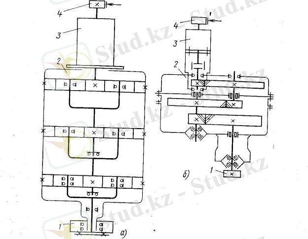 Сурет 2. 5 КБ сериялары крандарға арналған бұрылу механизмдерінің кинематикалық сызбалары көрсетілген. Біреулерін крандарда цилиндрлік тісті тапсырулармен редукторды қолданады, басқаларды - редукторлар планетарлық тапсырумен. Бұл жағдайда және өзге де жағдайларда бөлшектері тік орналасқан қозғалтқыштан 3, тежеуіш 4 редуктор 2. Сіздер редуктор бөлігіне анықталған бастаушы тісті дөңгелек 1, орнында болған тұрақты ілінуде тіреп - айналдыратын қозғалусыз тісті тәжымен шеңбер.