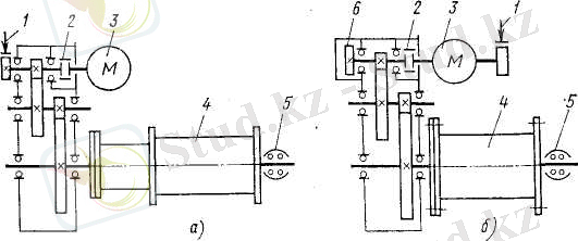 Жүк көтергіш механизм және жебе жай өзгерту механизмі электрлік келтірумен жүк арбаларды ұсынады (сурет 2. 6) . қозғалтқыштын айналуы 3 құрастыратын муфта арқылы екіншісіне беріледі кіріс білік редуктор. Осы білікке немесе қозғалтқыш білігінде электр-магниттік тежеуіштер екі құдықтық шкив анықталған 1. Шығатын