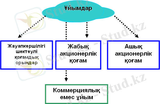 - Коммерциялық емес ұйым (КЕҰ) болып, өзінің қызметінде пайда табу негізгі мақсаты болып табылмайтын және пайда бола қалған жағдайда қатысушылар арасында бөлінбейтін ұйым танылады. КЕҰ - ның меншікті жарғылық капиталы болмайды, бірақ өз меншігінде немесе басқаруда бір қатар «беделі» болады.