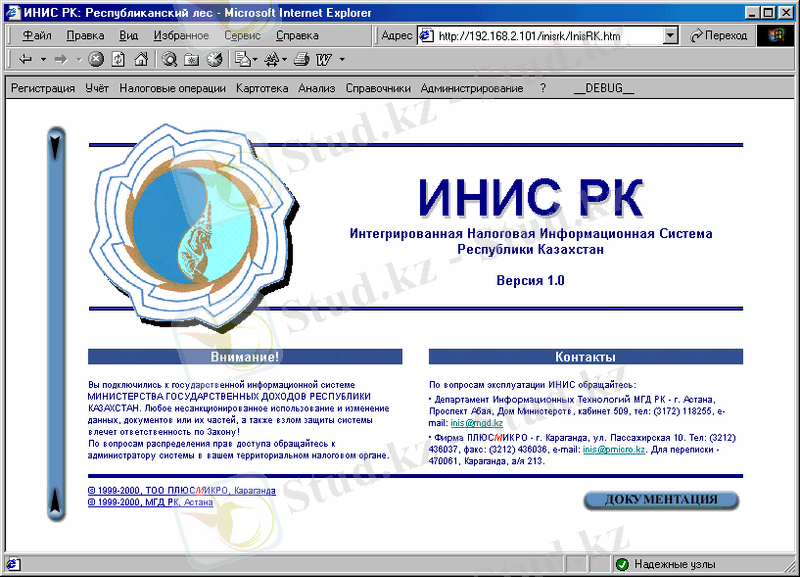 Терезенің төменгі бөлігінде екі ссылка орналасқан, олар: ПЛЮС/МИКРО Web-серверлерінің (URL) адрестері және ҚР ҚМ СК Internet. Егер ұйымыңыз және компьютеріңіз Internet әлемдік желіге қосылған болса, онда тышқанның көмегімен керекті ссылканы таңдап, осы серверлерде сақталатын ақпараттарға рұқсат ала аласыз.