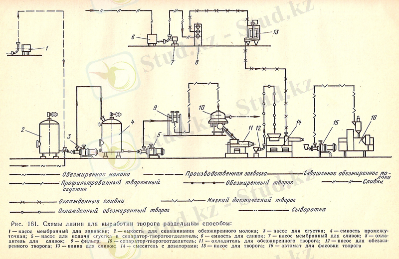1. сурет. Ірімшікті бөлу әдісімен өндіру линиясының сұлбасы: 1- ашытқы үшін мембраналық сорап; 2 - майсызданған сүтті ашыту үшін сыйымдылық; 3 - ұйытынды үшін сорап; 4 - аралық сыйымдылық; 5 - айырғы - ірімшік дайындағышқа ұйытындыны беру сорабы; 6 - кілегей үшін сыйымдылық; 7 - кілегей үшін мембраналық сорап; 8 - кілегей үшін салқындатқыш; 9 - сүзгіш; 10 - айырғыш ірімшік дайындағыш; 11- майсызданған ірімшік үшін салқындатқыш; 12 - майсызданған ірімшік үшін сорап; 13 - кәлегей үшін сенгел; 14 - тығыны бар араластырғыш; 15 - ірімшік үшін сорап; 16 - ірімшікті бөліп өлшеу автоматы.