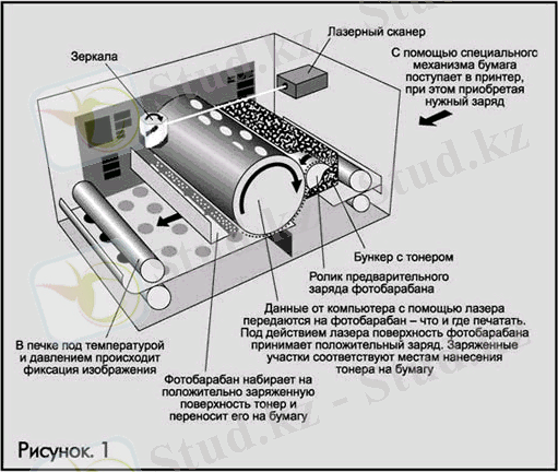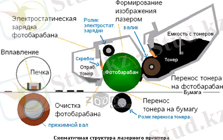Лазер принтерлердің көпшілігінде көшірілімді аппарат сияқты баспа механизмі қолданылады. Негiзгi түйiн қағазға сурет басатын қозғалатын барабан болып табылады. Барабан жартылай жабулы жігі бар металлдық цилиндрді құрайды. Барабанның бетi дәрежемен статикалық оқталады. Лазердің барабанға бағыттылған сәулесі электростатикалық заряд нүктеге дәл тигізуді өзгертеді және суреттiң электростатикалық көшiрмесiн барабанның бетiнде жасайды. Осыдан кейін барабан бетіне бояу порошог ізігі жағылады (тонер) . Тонердің бөлшектері тек қана электрмен оқтаулы нүктелерге ғана тартады. Парақ тартпадан шығады және оған электриялық заряд береді. Барабанға салғанда, парақ өзіне қарай барабаннан тонер бөлшегін тартады. Тонерді бекіту үшін, парақ қайтадан оқталады және 180 градустарға дейiн қыздырылған бiлiктер арасынан өтеді. Соңында, барабан бәсеңдейді, тонерден тазартылып, қайтадан қолданылады. Сурет түрлi түстi баспа жанында тетiк арқылы парақтың 4 өтуiнде әртүрлi түстiң тонерлерімен араластыруымен қалыптасады. Қағазға әрбiр өтуде бiр түстiң тонерiнiң мөлшерi келтiрiледi. Түрлі түсті лазерлік принтерлерде сәйкесінше оның габариттері мен бағасын үлкейтетін тонерге арналған 4 резервуар, жедел жады, процессоры мен қатты дискісі бар күрделі құрылғы.