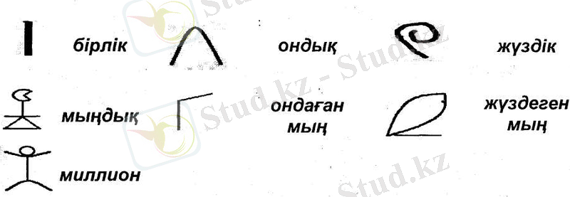 Ежелгі мысырда санау жүйесінде 1, 10, 10 2 , 10 3 , 10 4 , 10 5 , 10 6 , 10 7 сандарды белгілеу үшін арнайы символдар пайда бола бастады.