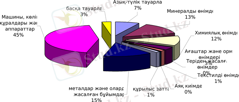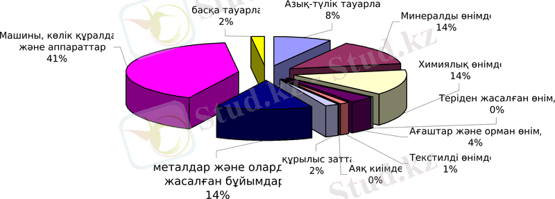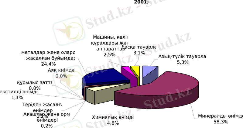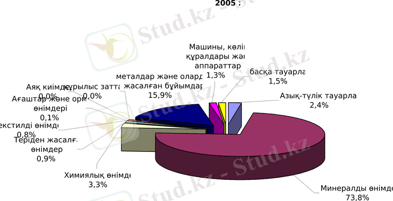 Сыртқы сауда көрсеткіштерін статистикалық талдаудың нәтижесінде көрсеткендей: экспорт көрсеткіштері соның ішінде жалпы жиынтықтың ең жоғарғы үлесін минералды өнімдер 2001 жылы 58, 2-ын құраса, ал 2005 жылы жалпы жиынтықтың 73, 8-ын құрады, ал жиынтық көрсеткіштің көп үлесін алып отырған келесі көрсеткіш ол металдар және олардан жасалған бұйымдар 2001 жылы 24, 4-ын құрады, ал 2005 жылы 15, 9-ын құрады, бұл көрсеткіш 2001 жылмен салыстырғанда 8, 5-ға төмендеп кетті. 8 суретте көрсетілген көрсеткіштер көрнекті түрде көрсетілген.