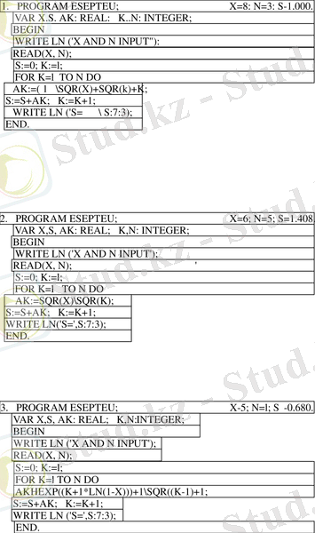 AK:=EXP((K+1 * LN( 1 -X) ) ) +1 \SQR((K-1) +1) ; S:=S+AK; K:=K+1; UNTIL ABS (AK) <N; WRITE LN('S=', S:7:3) ; END.