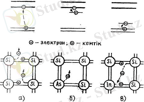2-сурет. Таза (а), n-Түрлі (б) және р-түрлі (в) шала өткізгіштердің энергетикалық аймақтары мен заряд тасымалдаушылардың пайда болу сұлбалары.