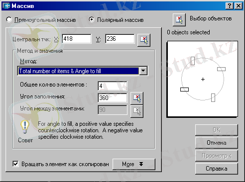 - Ашылған Method терезесінде үш элемент пайда болады:Total number of Items: басты және көшірілетін объектінің жалпы саны. Angle to fill: массивпен қамтылатын шеңберлі сектор шамасын белгілеу. Angle between Items : шеңберлі массивтің екі көршілес объекті арасындағы бұрышты белгілеу.