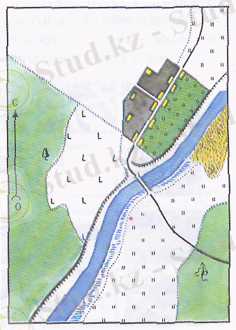 1. Жергілікті жердің планы. 16-суретті мұқият қарап шық. Ондағы көк түсті ирек сызық - өзен; ағаштың суреті салынып қоршалған алқап - орман; ұсақ қоңыр нүктелер - құм; көп қорапшалар - селодағы үйлер; үстіне ұсақ дөңгелекшелер салынып, жасыл түске боялған жер - жеміс бағы. Олардың бәрінің де мөлшері барынша кішірейтіліп көрсетілген. Жер бетінің қағазға осылайша кішірейтіліп түсірілген нұсқасын план деп атайды (латынша планус - жалпақ, тегіс) .