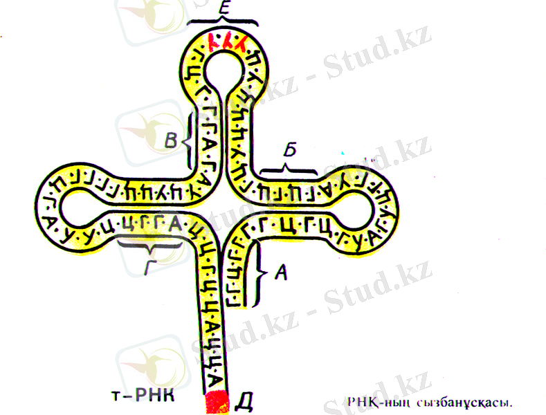 1. Тасымалдаушы РНҚ (т-РНҚ) . Жасуша ядросындағы т-РНҚ-ның мөлшері 10%-тей болып, молекулалық салмағы 20 000-50 000-ға дейін жетеді. т - РНҚ-ның негізгі қызметі ақуыз молекуласының синтезі кезінде аминқышқылдарын рибосомаларға тасиды. Әрбір аминқышқылының өзіне тән ерекше т-РНҚ-сы болады, яғни аминқышқылының әрқайсысына бір т-РНҚ сәйкес келеді. Сондықтан да т-РНҚ-ның жиырмадан астам түрі бар. Олар бірінші реттік құрылымымен ерекшеленеді.