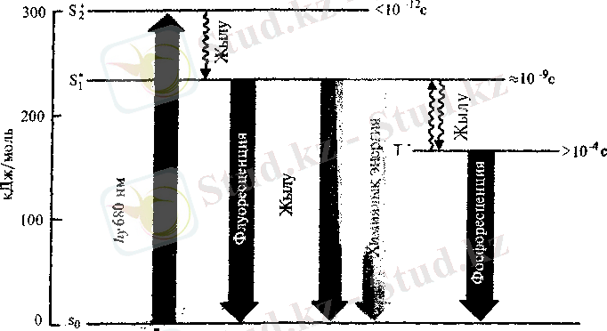 жұмсалады. Хлорофилл молекуласының энергетикалық күйлері және электронды қозу энергиясының жұмсалу жолдары. Сандар молекуланың жеке күйдегі өмірін көрсетеді (секунд) (В. В. Полевой, 1989) . Осындай өзгерістер фотосинтездік жүйелер құрамындағы барлық пигмент молекулаларына тән деуге болады. Яғни, олардың әрқайсысы өздерінің молекулалык құрылысына байланысты толқын ұзындықтары түрліше сәулелерді өшіріп, оны соңында реакциялық орталықтағы фотохимиялық реакцияға тікелей қатысатын хлорофилл