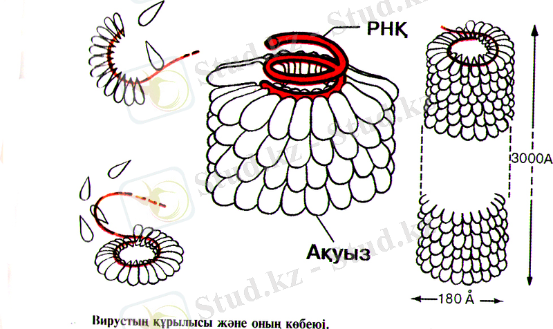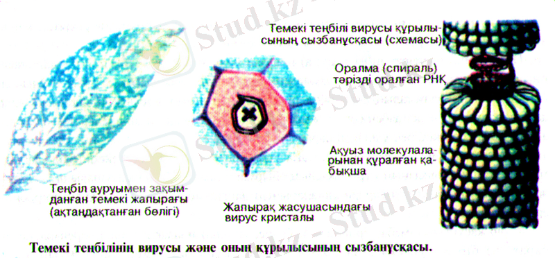 Вирустардың құрылысын темекі теңбілі мен бактериофактарды мысалға алып қарастырайық. Темекі теңбілі вирусы темекі жапырақтарындағы хлоропластарды бүлдіреді. Осының нәтижесінде жапырақтардың түсі өзгеріп, тенбілденеді. Жапырақ алақаны бүрісіп, шиыршықтанады және тостағанша мен күлте жапыракшалары да өзгереді. Темекі тенбілінің вирусымен зақымданған жапырақ 9-11 күннен сон сарғая бастайды. Электрондық, микроскоппен 300 мың есе үлкейтіп көрсетудің нәтижесінде оның пішіні таяқша немесе жіп тәрізді, іші қуыс цилиндр сияқты болатыны анықталды. Оның қабырғасы ақуыз молекуласынан, ал ақуызды қабықшаның ішінде оралмаға айналған РНК. молекуласы орналасқан. У. Стенлидің дәлелдсуі бойынша, темекі жапырағындағы вирус бөлшектері алты қырлы кристалл пішінді шоғыр түзеді, оны 29-сыбанұсқадан байқауға болады.