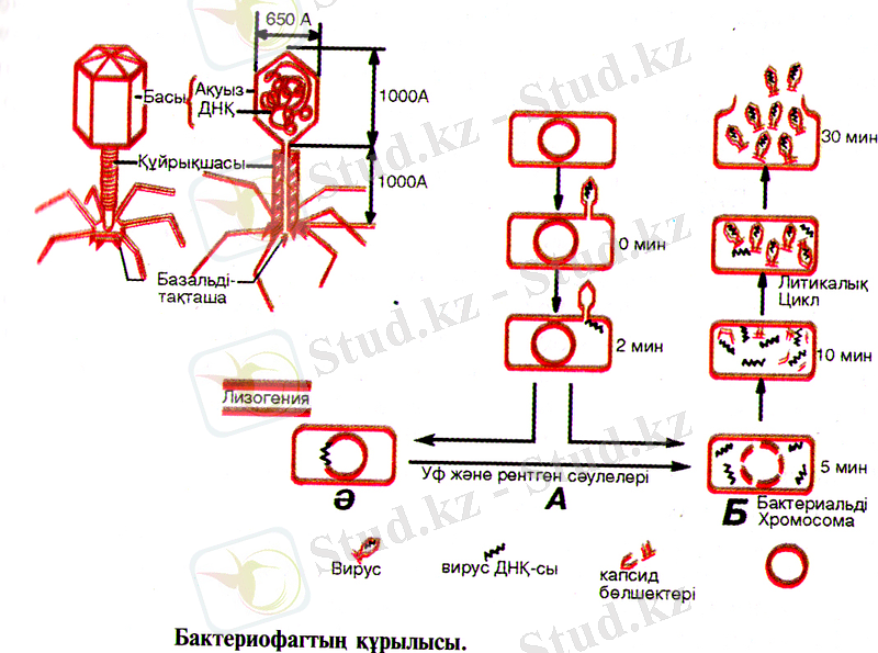 Бактерияларды ерітіп жіберетін вирустар тобы болады, оларды бактериофагтар деп атайды. Бактериофагтар грекше «фагж» - жебір деген мағынаны білдіреді. Бактериофагты алғаш рет 1915жылы. Ф Туорт ашқан болатын. Бактериофагтардың пішіні итшабаққа ұқсайтындығы 31-суретте бейнеленген. Олардың денесі бас, мойын және құйрықшадан тұрады. Вирустығ басын ақуыз қабықшасы қаптайды, ішінде ДНҚ, кейде РНҚ қышқылы болады. Басының мөлшері 40 нм, ал құйрығынын ұзындығы 20 - 225 км-ге тең болады. Құйрығы іші қуыс ақуызды түтік. Енді бактериофагтың бактерия жасушасына енгеннен кейінгі іс-әрекетін 31-суреттік негізінде қарастырайық.