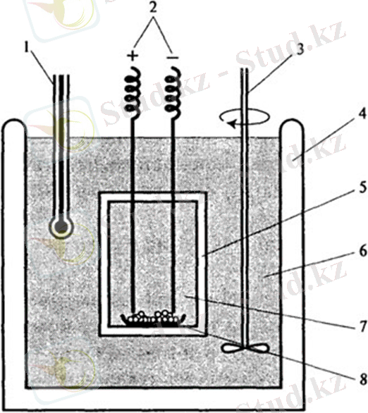 1 - термометр; 2- «жандыру» электродтары; 3 - араластырғыш; 4 - жылу оқшаулау корпусы; 5- «бомба»; 6 - белгілі көлемдегі су; 7-оттегі; 8 - өлшеуге арналған азық-түлік үлгісі.