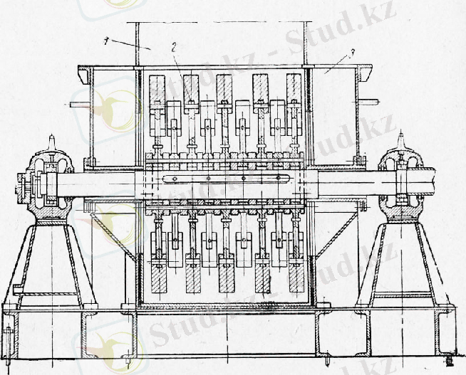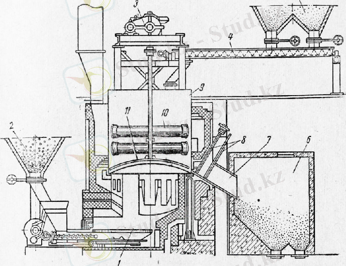 1- топка; 2-отынға арналған бункер; 3-араластырғышты жетек ; 4-тиеу шанағы; 5- ұнтақ гипс тасына арналған бункер ; 6- күйдірілген гипске арналған бункер; 7-қазандықтағы гипсті түсіру түтігі ; 8-шибер ; 9- қазан; 10- буды жоюға арналған келте құбыр; 11-араластырғыш