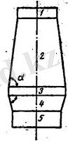 1-сурет- Домна пешінің қимасы. Домна пешінің қимасы. 1- колошник; 2- шахта; 3 - кеңбөлік; 4 - заплечиктер; 5 - көрік.