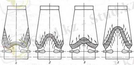 а - газ ағынының шеттен жүруі; б, в - газ ағынының аралық жүруі; г - газ ағынының ось бойында жүруі.