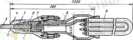1-Кабельді бекіту; 2 - сым жолағы; 3 - кабель-кабель; 4 - жылытқыштың басы; 5 - асбест өрімі; 6 - қорғасын құю; 7 - қысым гайкасы; 8 - терминал қуысы; 9 - жылытқышпіс түтіктер.