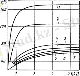 Сурет. 22-электр жылыту кезінде ұңғыманың кенжарларындағы температураның өзгеруі: 1-21 кВт; 2 - 10, 5 кВт; 3, 4 - 21 кВт; 5, 6, 7-10, 5 кВт.