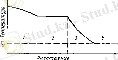 Сурет. 31-су буын айдау кезінде қабаттағы температураның таралу схемасы. Аймақтар: 1-қызып кеткен бу: 2 - қаныққан бу; 3 - ыстық конденсат: 4 - салқындатылған конденсат.
