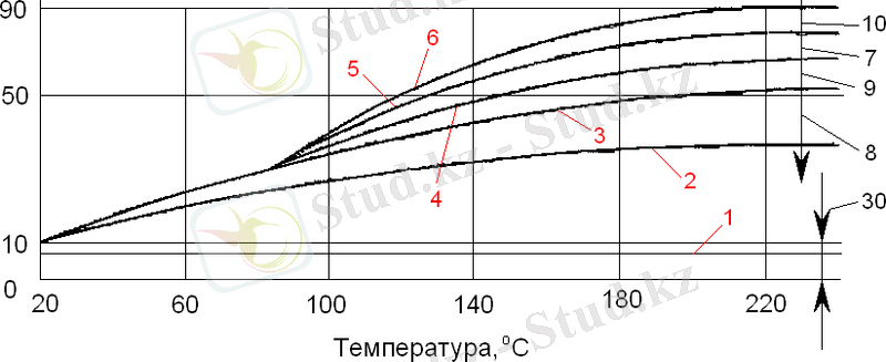 1-табиғи (қабат) температурада сарқылу режимі; 2 - тұтқырлықтың төмендеуі; 3 - термиялық кеңею; 4 - дистилляция; 5 - Газ қысымы режимі; 6 - қозғалғыштығының өзгеруі.
