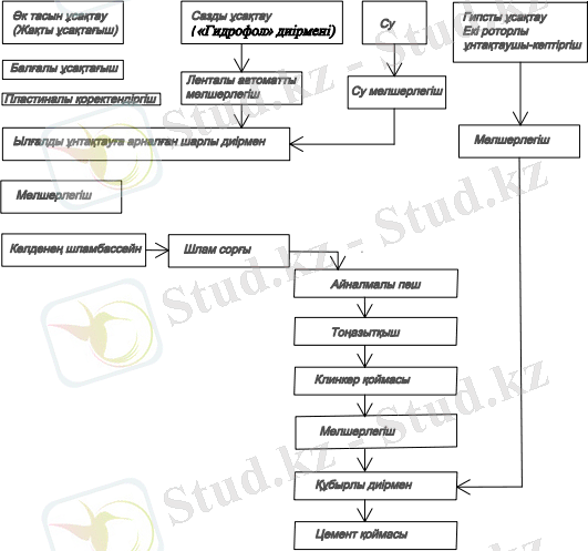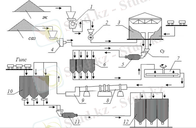 1 - Беттік ұсақтағыш; 2- баллғалы ұсақтағыш; 3- шикізат қоймасы; 4 - «Гидрофол» диірмені; 5 - ылғал ұнтақтау диірмені; 6 - тік шлам бассейн; 7 - көлденең шламбассейн; 8 - айналмалы пеш; 9 - тоңазытқыш; 10 - клинкер қоймасы; 11 - диірмен; 12 - цемент силосы.