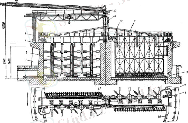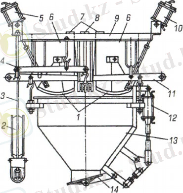 1-резервуар; 2-пропеллер түріндегі араластырғыштар; 3, 10-дөңгелек рельс; 4-Кран-Арқалық; 5-құбыр; 6-бак; 7 - шлам құбыры; 8 - жүріс арбашығы; 9 - жетек; 11 - қырғыштар; 12 - орталық тірек; 13-көпір