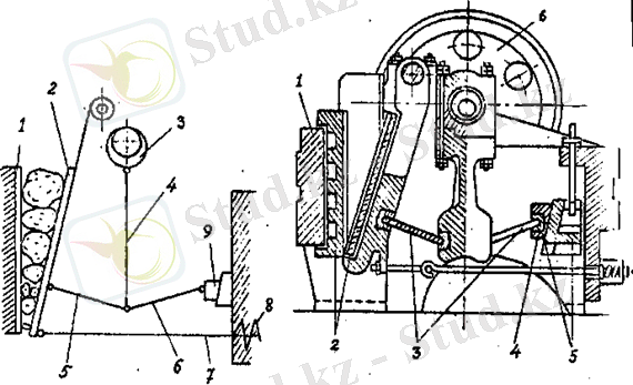 1- қозғалмайтын жақ; 2- қозғалмалы жақ; 3- эксцентрикі білік; 4- шатун; 5-алдыңғы плита; 6-артқы плита; 7- жетек; 8- серіппе; 9-реттеу сыналары.