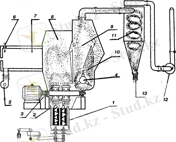 1-бункер-қоректендіргіш; 2-төменгі жұмыс камерасы; 3-ұсатқыштың бірінші сатысы; 4-ұсатқыштың екінші сатысы; 5-ауа үрлегіш; 6-жанарғы; 7 - Жылу генераторы; 8-кептіру камерасы; 9-кептіру камерасы; 10-жоғарғы жұмыс камерасы; 11-циклон; 12-желдеткіш; 13-Ысырма