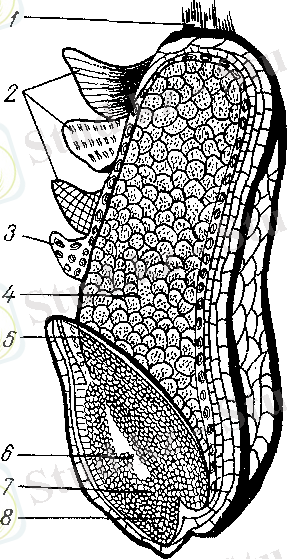 1-шоқша мұрттар; 2- жемісті және тұқымды қабықша; 3- алейронды қабат; 4-эндосперм;