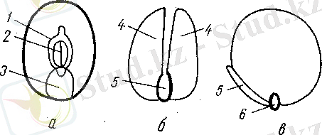 және ұрығы алынған (в) . 1-ұрық жиегі; 2- жиек ізі; 3- түбінің кескіні; 4- дән жарнағы;