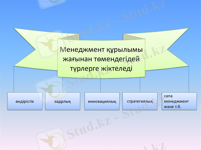 Менеджмент бұл нарықтық экономика жағдайында өндірісті тиімді басқарудың теориясы мен практикасы. Менеджмент бұл нақты мақсатты жүзеге асыру үшін кәсіпорын жұмысын басқаруға және ұйымдастыруға байланысты адамдар қызметінің түрі.