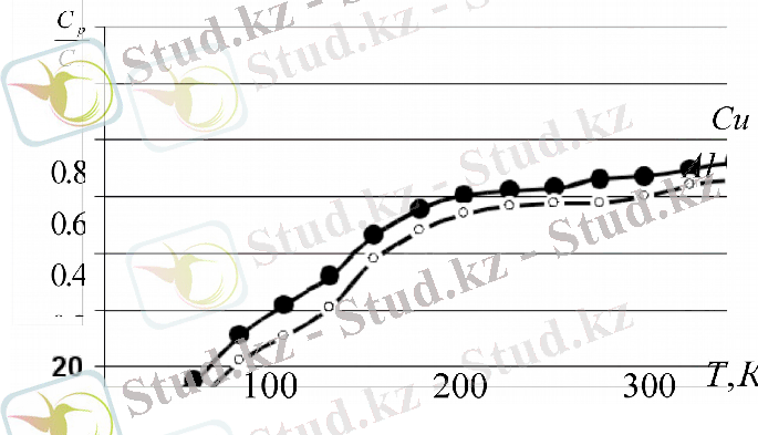 формуласымен құралған. Ал домалақ нүктелермен жылусыйымдылықтың эксперименттік өзгерісін белгілеген. Суреттен теория мен эксперименттің сәйкестігі көрініп тұр.